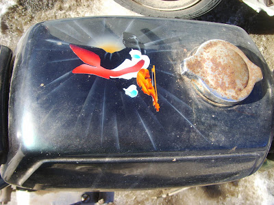 Idag kom den andra Puchen som jag har köpt hit. Har stått still i många år men är nog ganska ok. Göran som sålde den hade haft den då han var 16 och sålt den vidaren men sen köpt tillbaka den. Blev sedan stående länge innan han kom på att det finns andra högre prioriterade projekt och sålde den till mig. Kul detalj med denna är att den är lackad av Pirk. Pirk var nog Sveriges mest framgångsrika motivlackerare under en ganska lång period, han kom från Katrineholm och denna Puchen har snurrat i den trakten då den var färsk. Tanken ska sparas, tror att jag ska börja spara på tankar nu då jag har två olika med gammal motivlack, en till så är jag samlare. Tänka sig, en tidig Pirk, kan kanske bli nåt en dag.