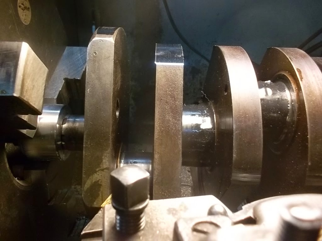Tog ett beslut i helgen att köpa en färdig lättad vev men det blev efter lite samtal med England så krångligt att min vevaxel hamnade i svarven. Har fått tag på en balansfaktor som bevisligen ska fungera, även ritning på hur det görs. På bilden ovan och under kan det ses hur mycket som försvinner på diametern, sen ska det fräsas. Ska försöka lura min utmärkta granne att göra det, då blir det bra. Vid svarvningen märktes att de inte var alltför noga på fabriken med symmetri och liknande ofog, efter första skäret så var det olika hur det hade tagit på var skinkpar.