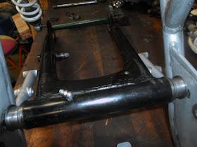 Skulle bara sätta dit en originalsving vilket borde passa direkt men med det flyt jag har just nu så gjorde det inte förståss. Hela bakramen är breddad och svarven fick leta redas på i verktygslådan, två distanser på 17mm vardera gnoddes fram som sen svetsades fast för att få lite bärighet i axeländarna.